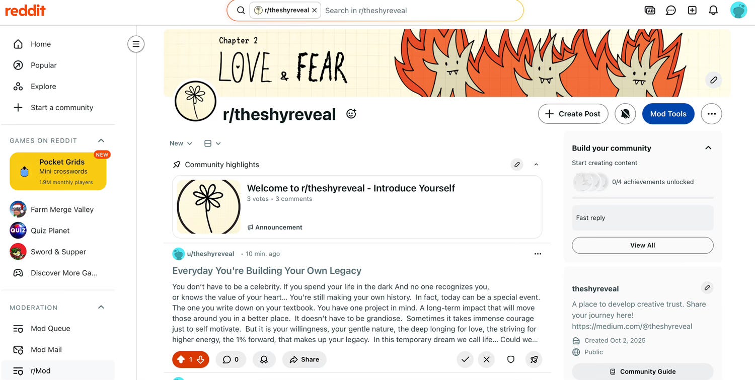 You’re also welcome to join the shy reveal subreddit, a space for cozy discussions about trust, personal development, and belonging.